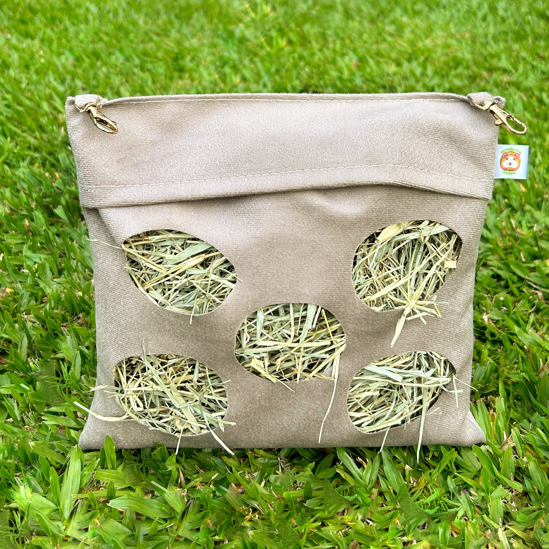 Porta feno no tamanho de 22x25cm, produzido em veludo e com ganchos em metal.