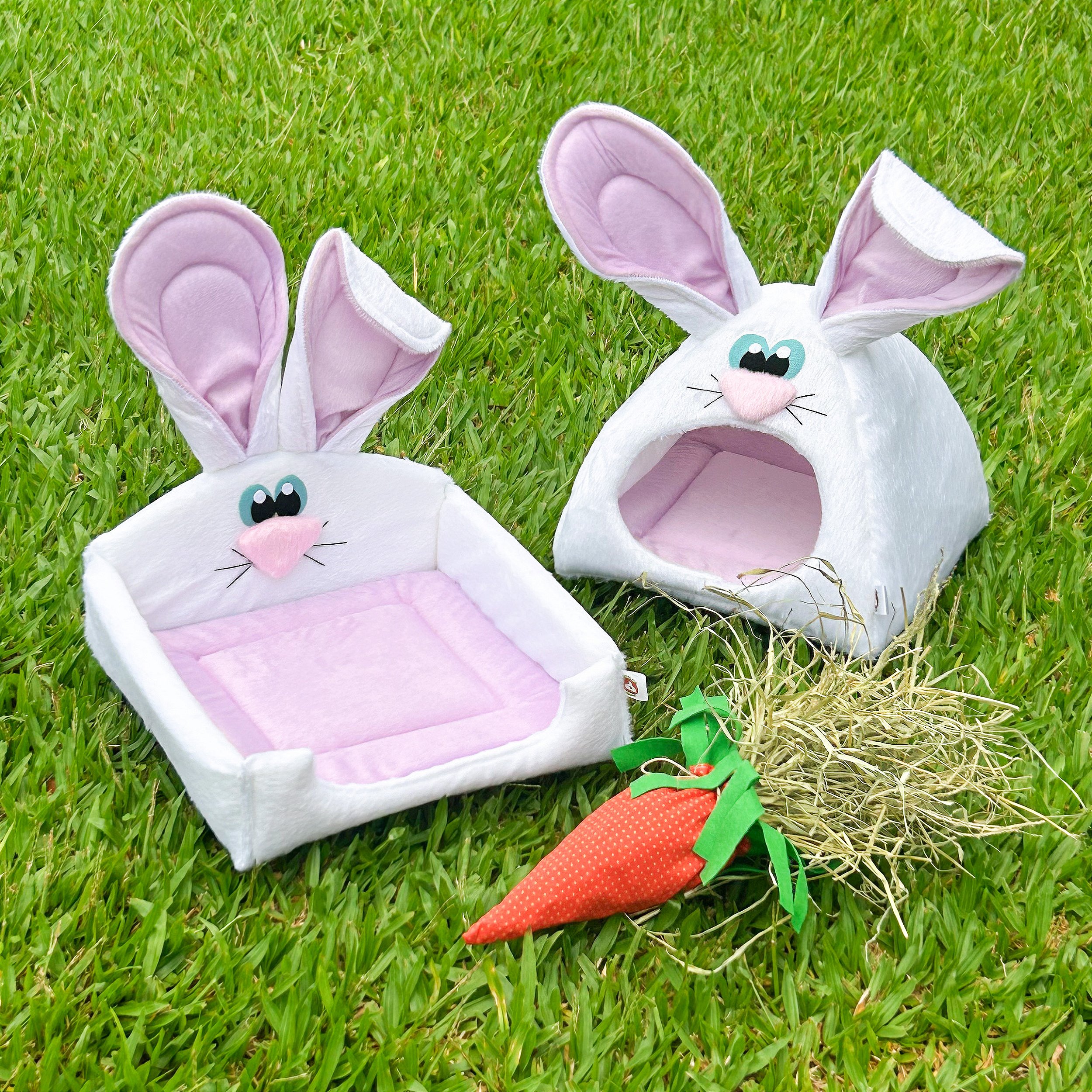 Material: Estrutura da caminha e da toquinha em veludo velhos com almofadinha removível produzida no mesmo material. Ambos preenchidos em espuma. Cenourinha de feno produzido em tricoline.